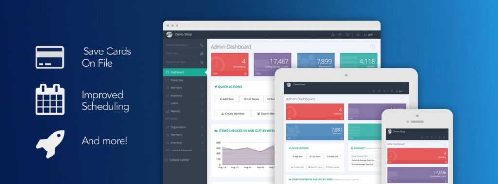 You can now securely save credit/debit cards on file for faster checkouts, to act as deposits, and more in addition to allowing users to purchase memberships/subscriptions online. We’ve increased the flexibility of emailed reminders so that you can specify how many days in advance they go out, rather than being limited to the day before items are due, more fields are searched when using the quick user search, and we have various improvements to multiple-location support and reservations.