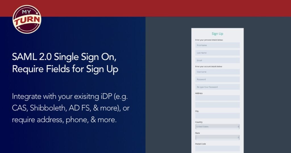 ˜˜, myTurn can now act as a SAML 2.0 SP (service provider) with your main Identity Provider (iDP). SAML is the “Assertion Markup Language” and one of the most widely supported single sign on (use the same account information for multiple systems) available. This includes compatibility with CAS, Shibboleth (common in university settings) and Microsoft’s Active Directory Federation Services (ADFS), including when using Azure. If you’re interested in our SAML support, please contact us!